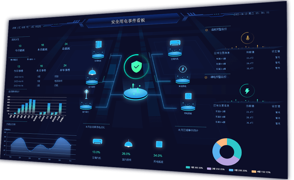 對電器設備及線路進行實時監(jiān)測和用電安全管控,提升事件預警和處理能力。當電器設備或周圍環(huán)境出現(xiàn)異常情況時發(fā)出設備檢查與維護預警,防止意外事故發(fā)生。